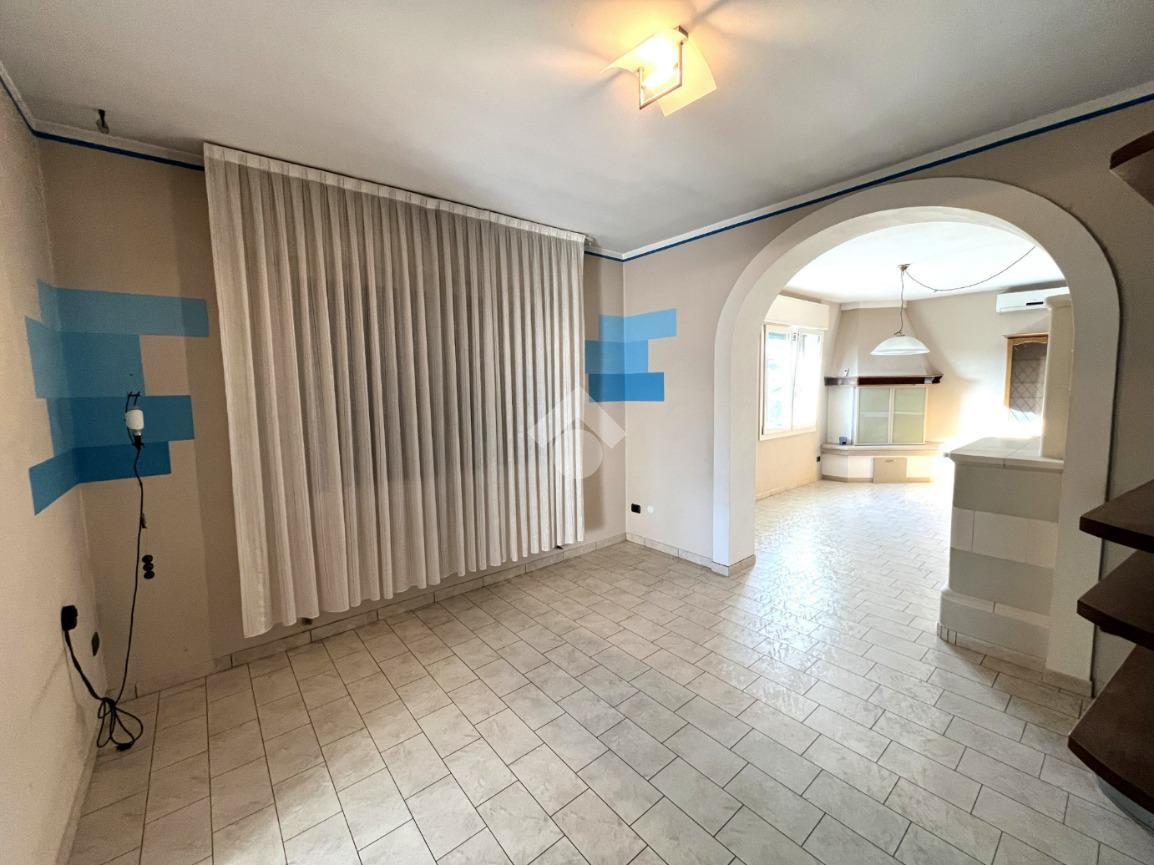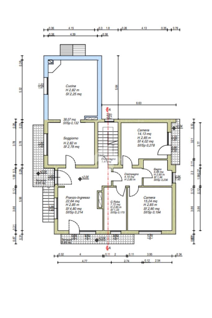 Salendo le scale esterne che ci conducono al piano rialzato, varcata la soglia d'ingresso veniamo accolti da una luminosa zona giorno-cucina separata dalla sala da pranzo. Percorrendo il disimpegno che ci conduce alla zona notte troviamo due camere da letto di circa 15mq ciascuna ,una terza stanza/studio ed un bagno con vasca.